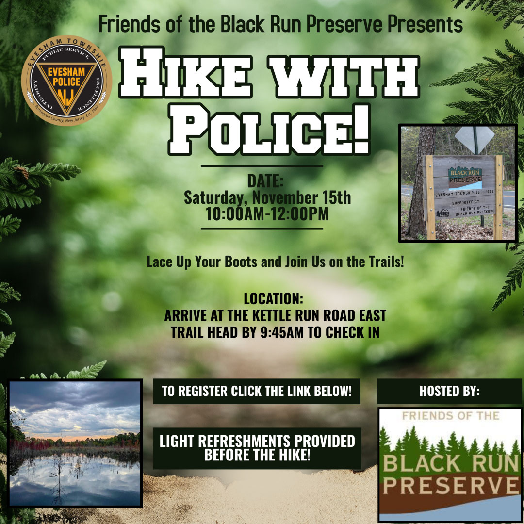 Celebrate National Take a Hike Day a little early by exploring the beauty of the Black Run Preserve! Evesham Police Officers will guide a 1.5–2 mile loop featuring interactive nature stations hosted by Friends of the Black Run Preserve Ambassadors.