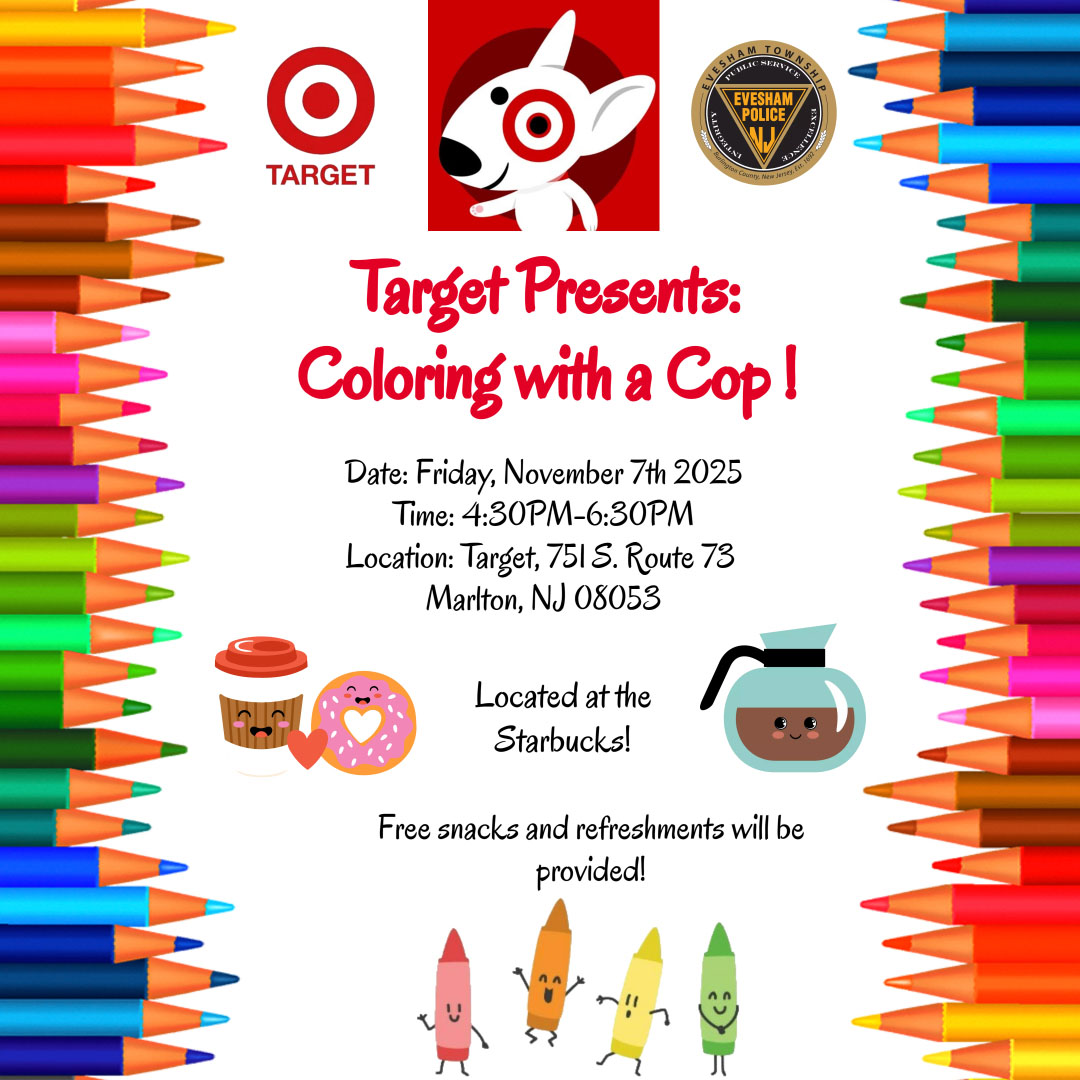 Join Evesham Police for a fun afternoon of coloring, coffee, and connection! Free snacks and refreshments provided.